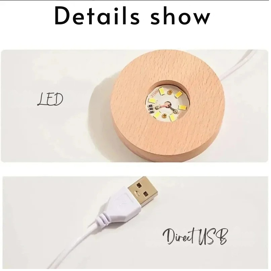 De houten LED-basis verspreidt een zachte gloed die je foto tot leven brengt en een gevoel van rust en verbondenheid oproept.